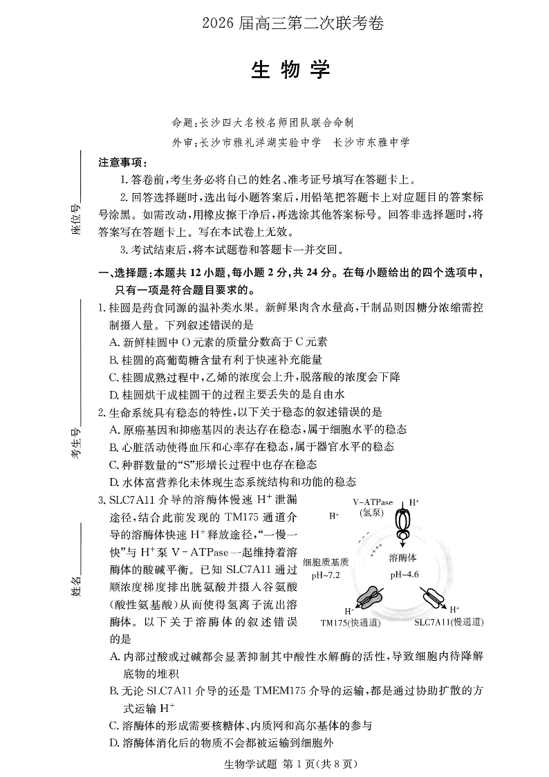 高三生物+答案--湖南佩佩教育战略合作学校2026届高三1月第二次联考