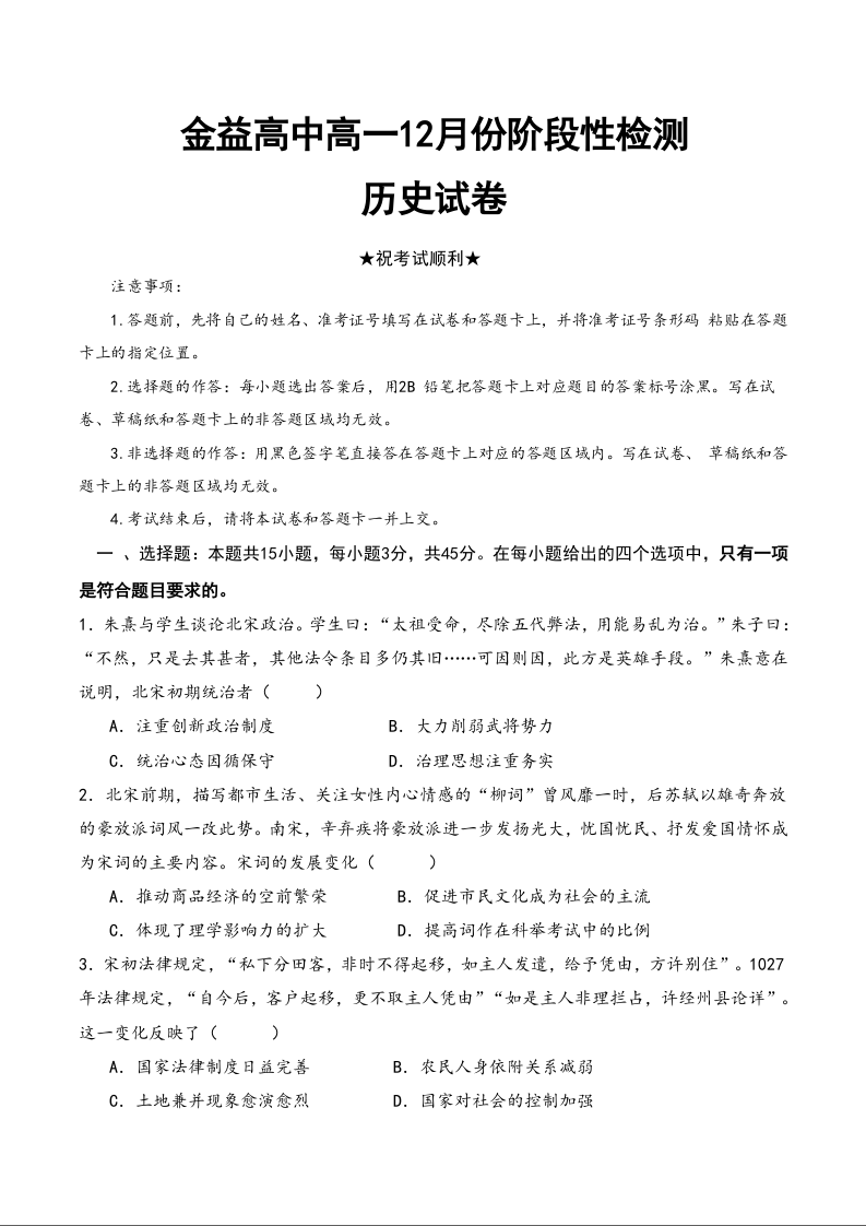 高一历史--湖北省孝感市汉川市金益高级中学2025-2026学年高一上学期12月月考