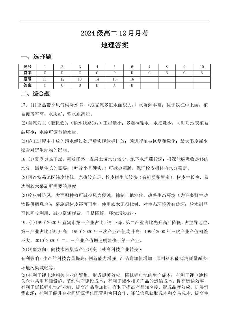 高二地理答案--四川省眉山市仁寿县第一中学校南校区2025-2026学年高二上学期12月月考