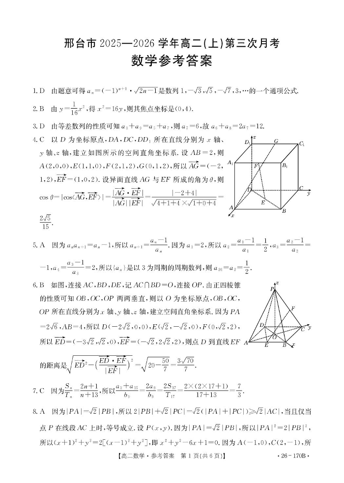 高二数学答案--河北省邢台市2025-2026学年高二上学期第三次月考