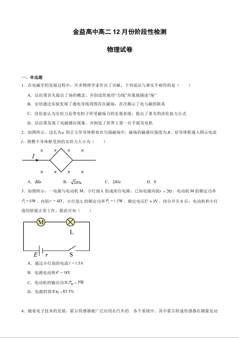 高二物理+答案--湖北省孝感市汉川市金益高级中学2025-2026学年高二上学期12月月考