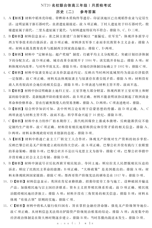 高三历史答案--河北省NT20名校联合体2026届高三上学期1月质检考试试卷