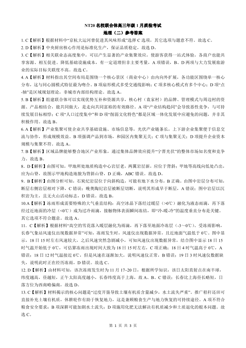 高三地理答案--河北省NT20名校联合体2026届高三上学期1月质检考试试卷