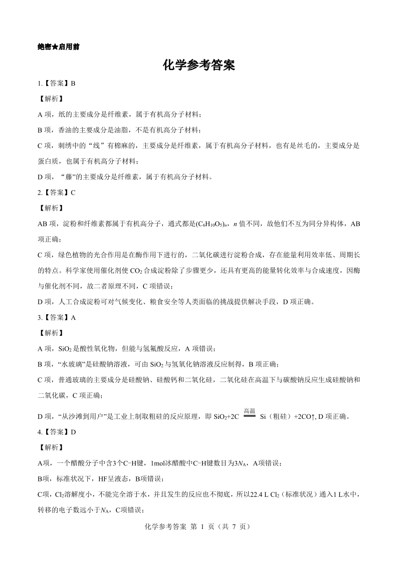 高三化学答案--山西省(三重教育)2023高三开学摸底考试