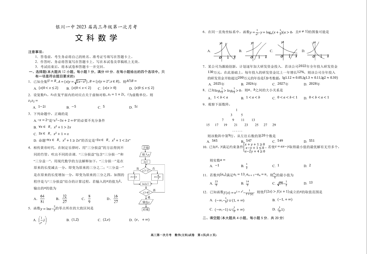 高三数学(文科)--宁夏银川一中2023高三上学期第一次月考