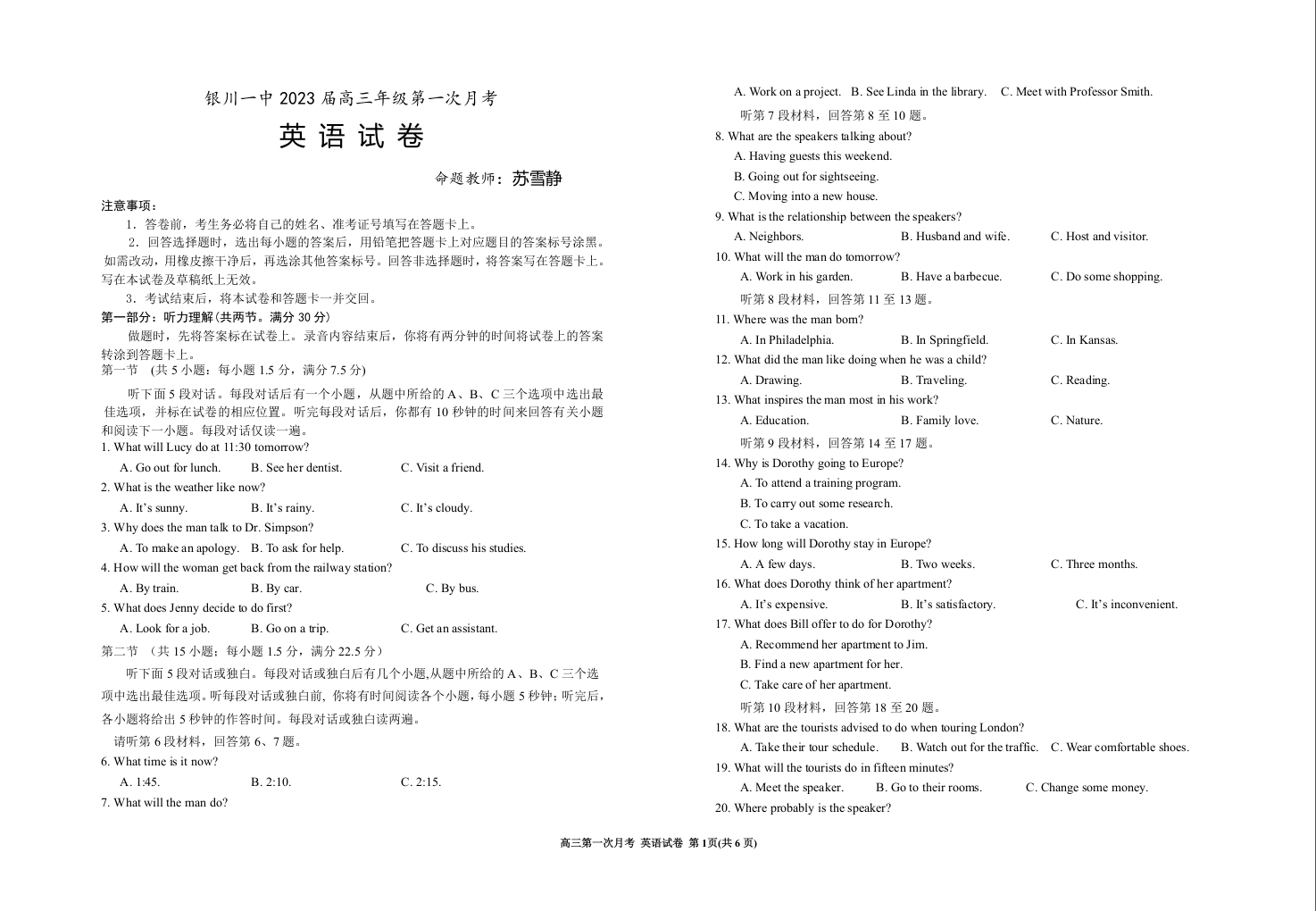 高三英语--宁夏银川一中2023高三上学期第一次月考