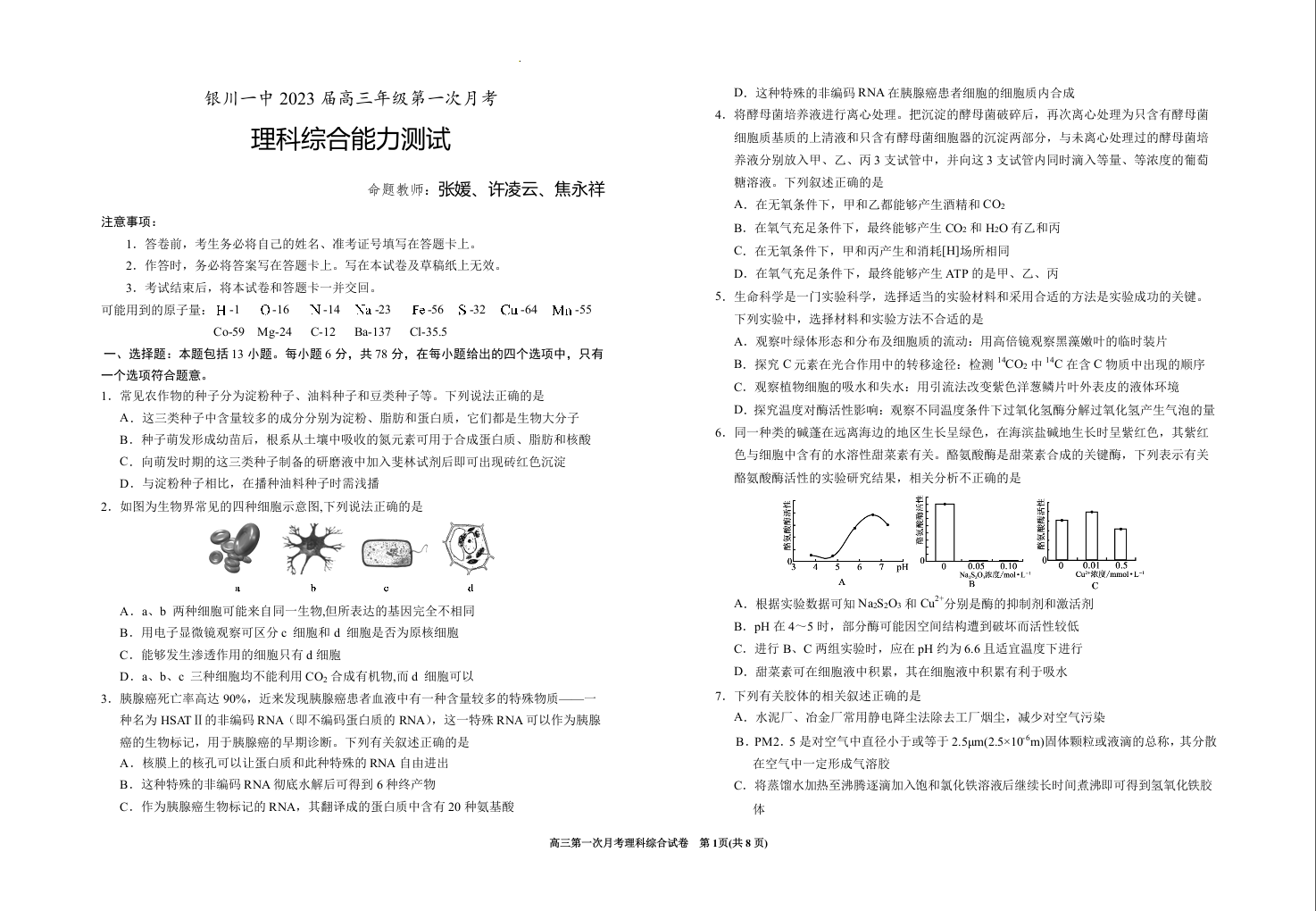 高三理综--宁夏银川一中2023高三上学期第一次月考