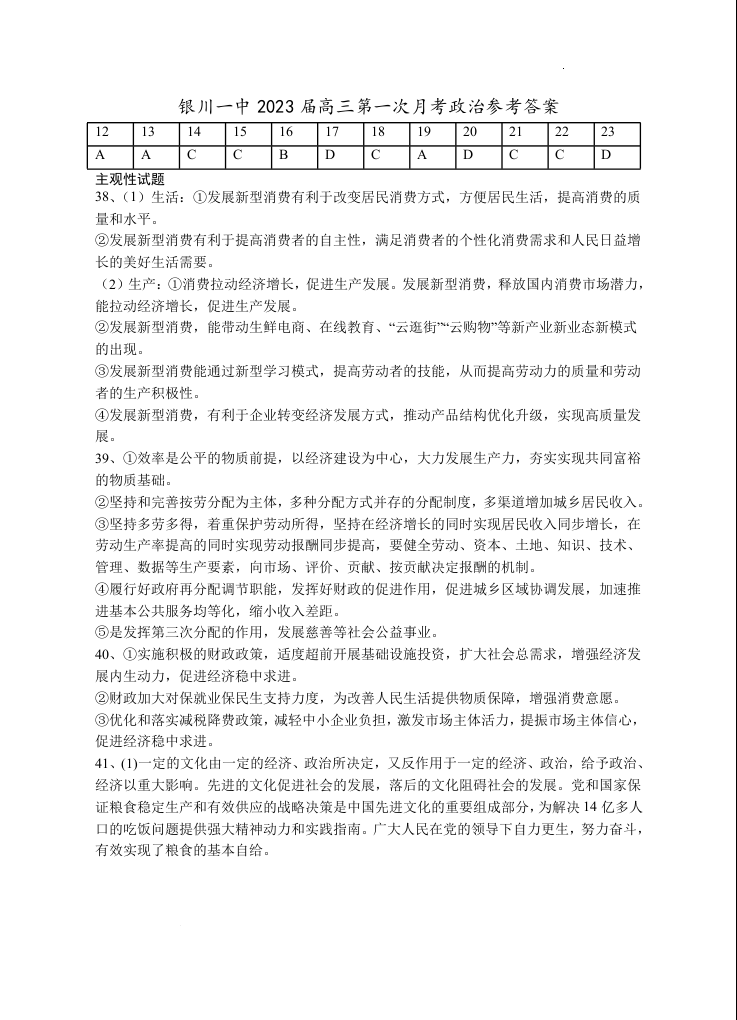 高三政治答案--宁夏银川一中2023高三上学期第一次月考