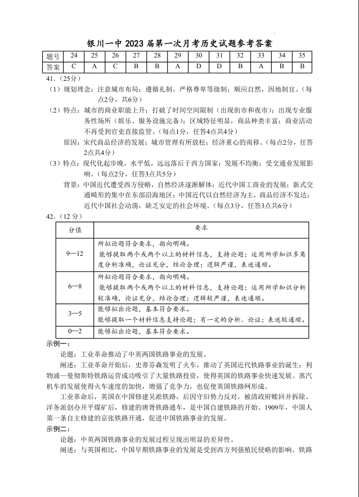 高三历史答案--宁夏银川一中2023高三上学期第一次月考