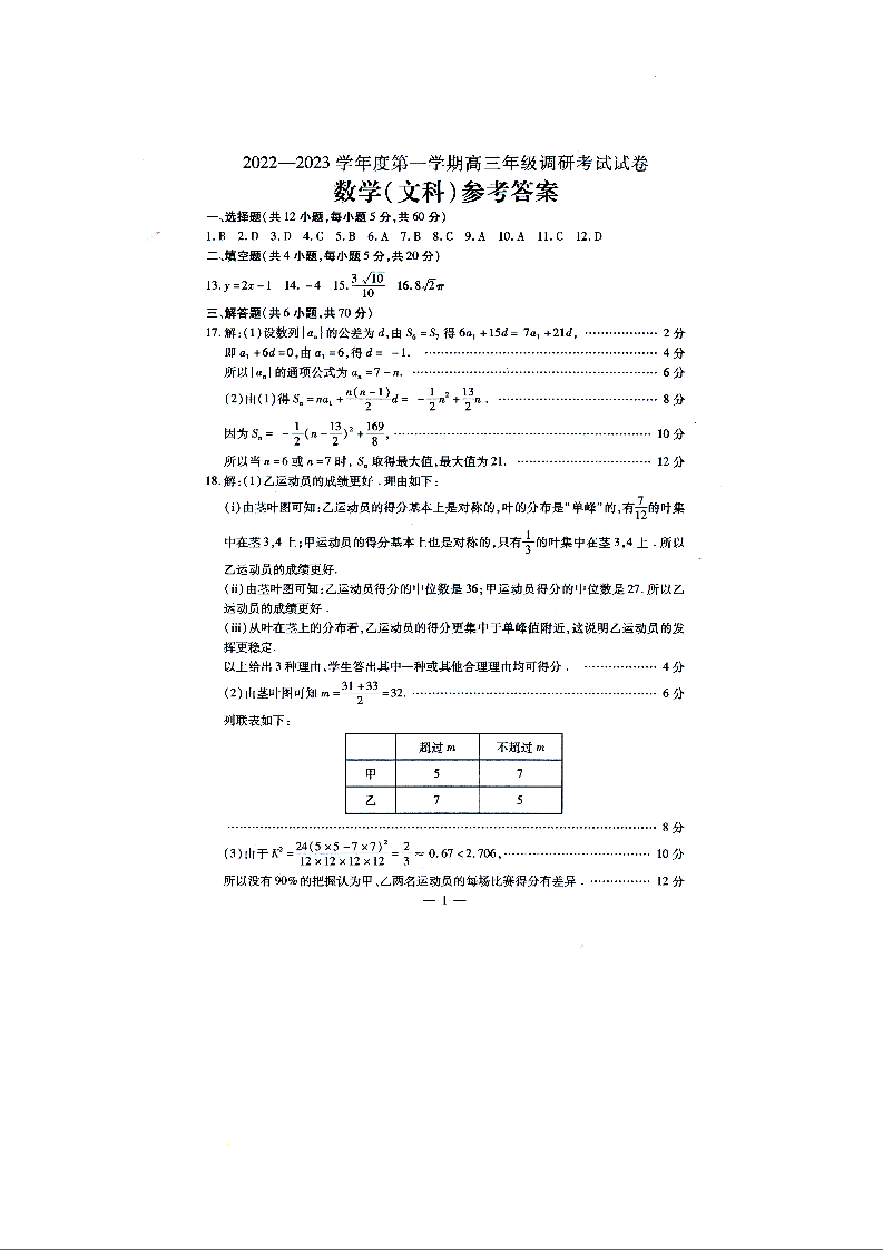 高三数学(文)答案--内蒙古包头市2023高三上学期开学调研考试