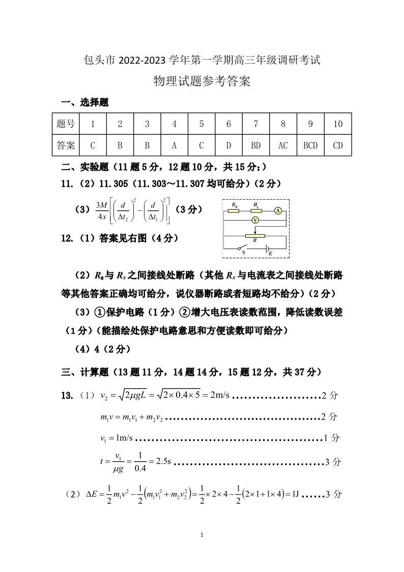 高三物理答案--内蒙古包头市2023高三上学期开学调研考试