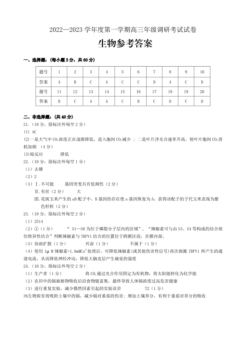 高三生物答案--内蒙古包头市2023高三上学期开学调研考试
