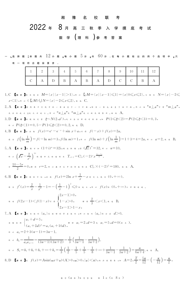 高三理数答案--湘豫名校联考2023高三8月入学摸底考试
