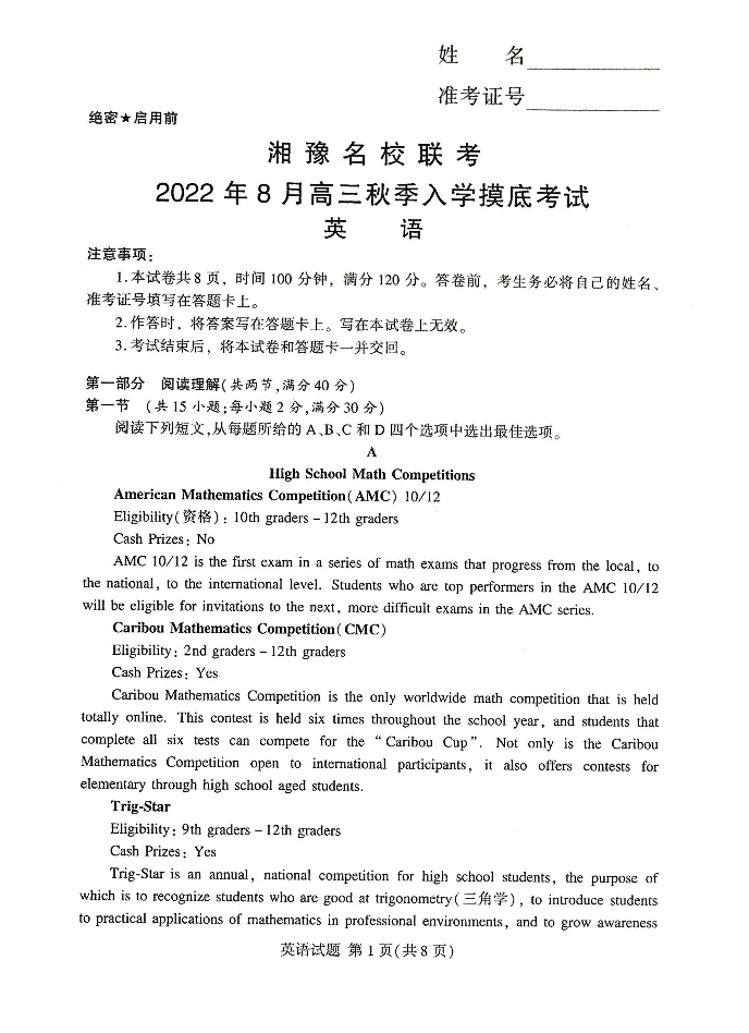 高三英语--湘豫名校联考2023高三8月入学摸底考试