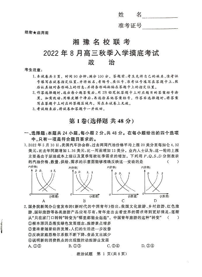 高三政治--湘豫名校联考2023高三8月入学摸底考试