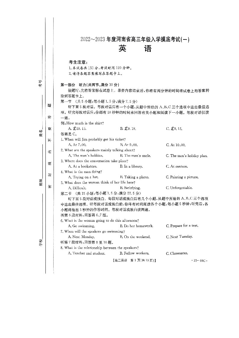 高三英语--河南省创新发展联盟2023高三上学期开学摸底考试