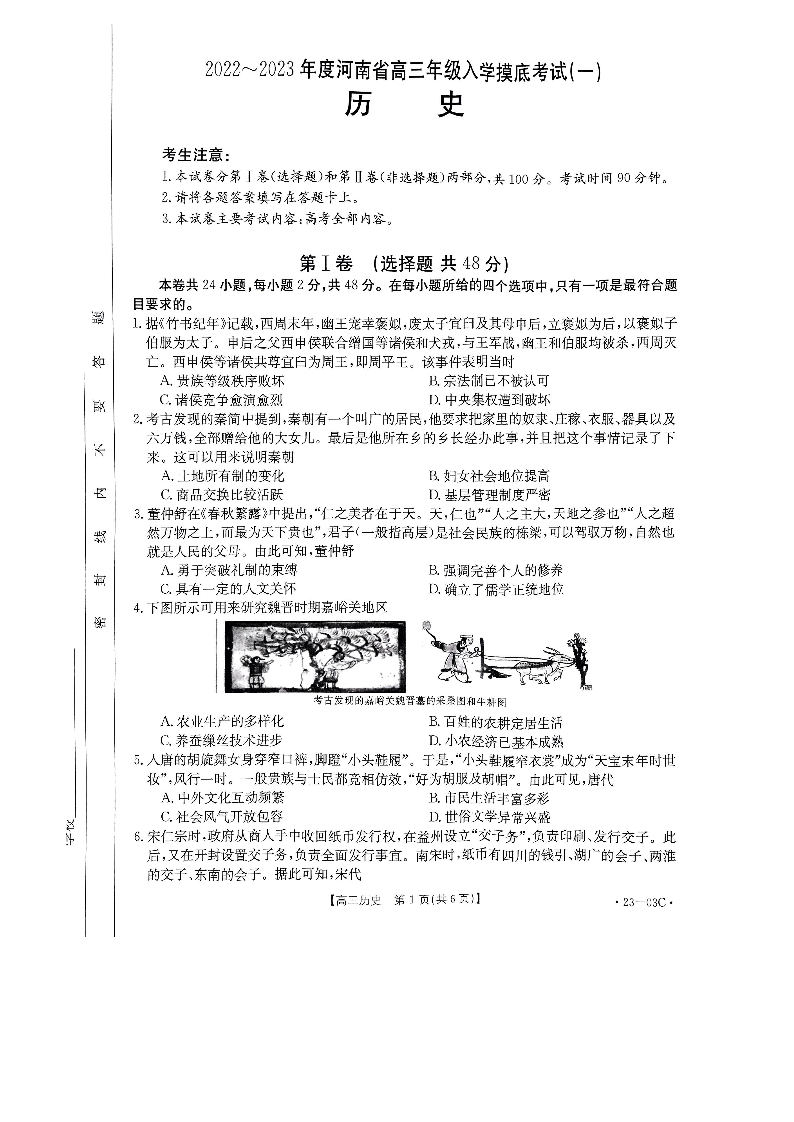 高三历史--河南省创新发展联盟2023高三上学期开学摸底考试