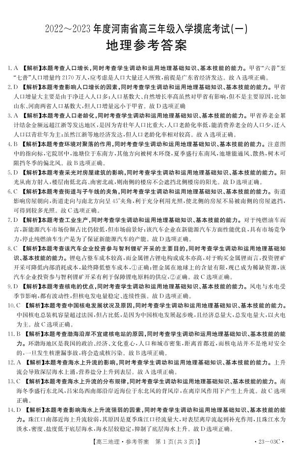 高三地理答案--河南省创新发展联盟2023高三上学期开学摸底考试