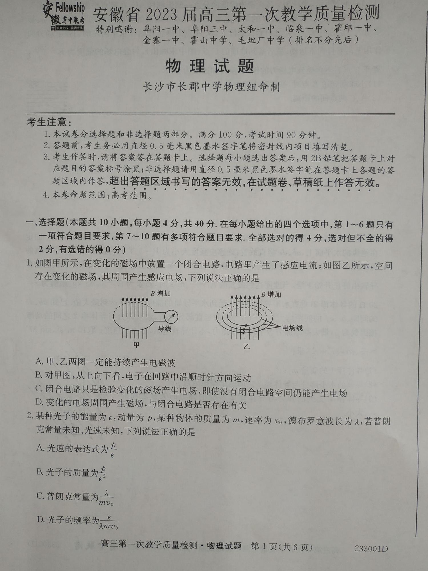 高三物理--安徽省十联考2023高三上学期第一次教学质量检测