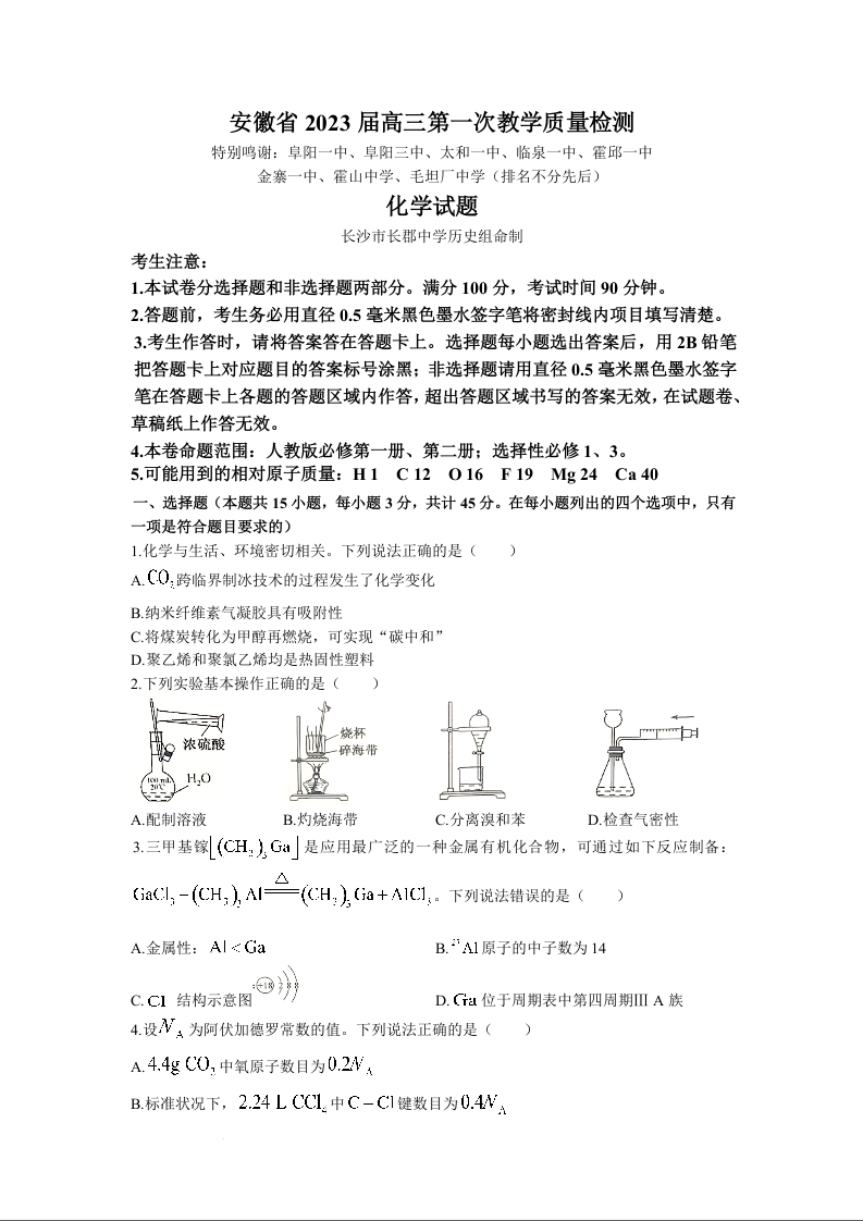 高三化学--安徽省十联考2023高三上学期第一次教学质量检测