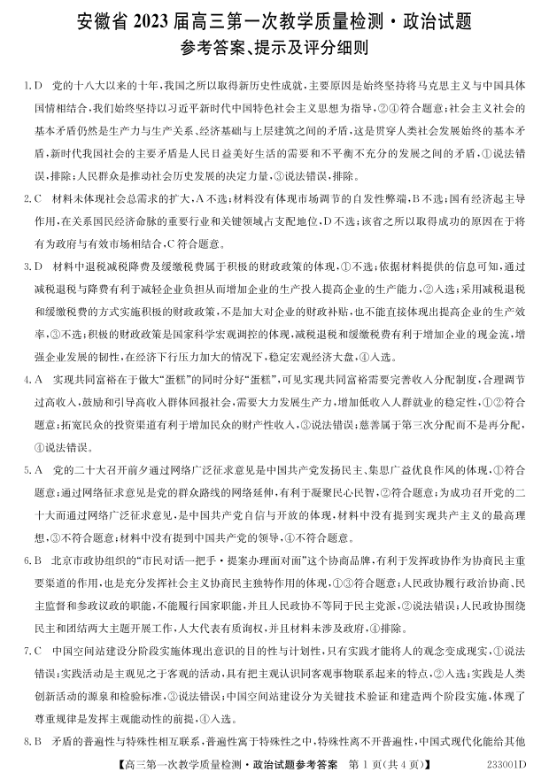 高三政治答案--安徽省十联考2023高三上学期第一次教学质量检测