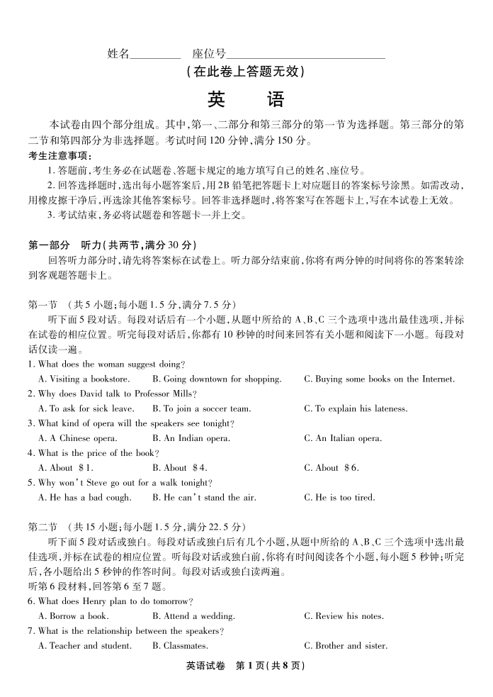 高三英语--安徽省蚌埠市2023高三第一次质量检查