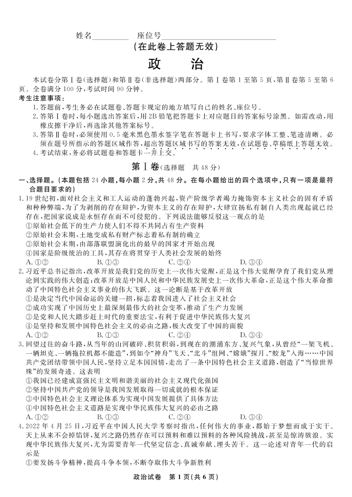 高三政治--安徽省蚌埠市2023高三第一次质量检查