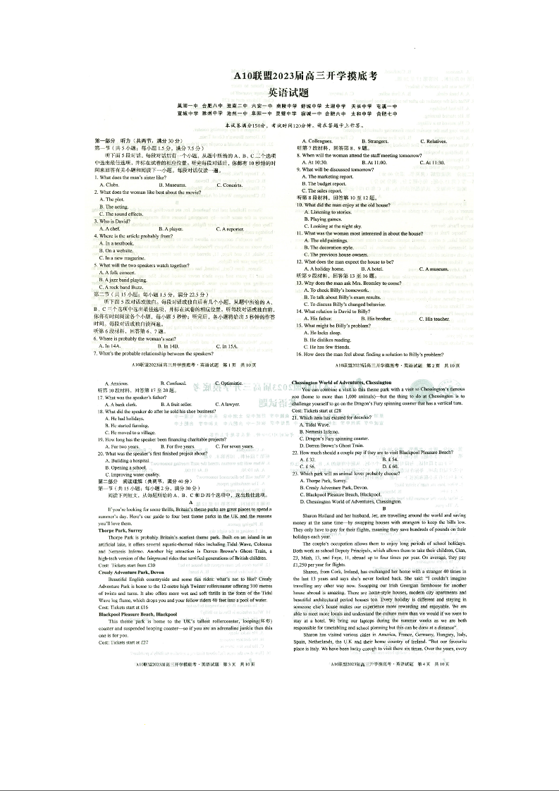 高三英语-安徽省A10联盟2023高三上学期开学考试8.29-30