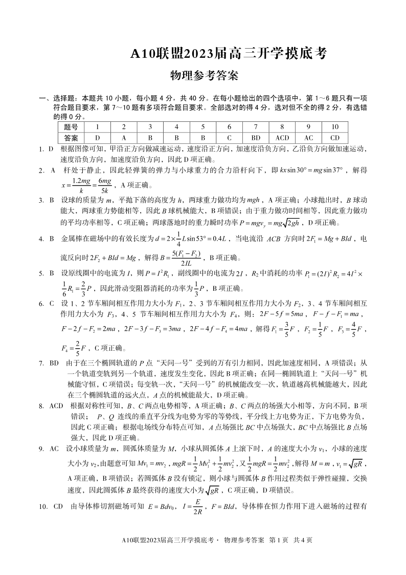 高三物理答案--安徽省A10联盟2023高三上学期开学考试8.29-30