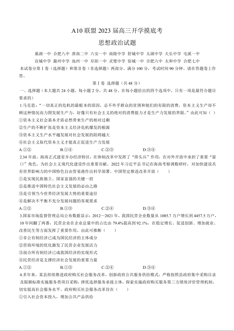 高三政治答案--安徽省A10联盟2023高三上学期开学考试8.29-30