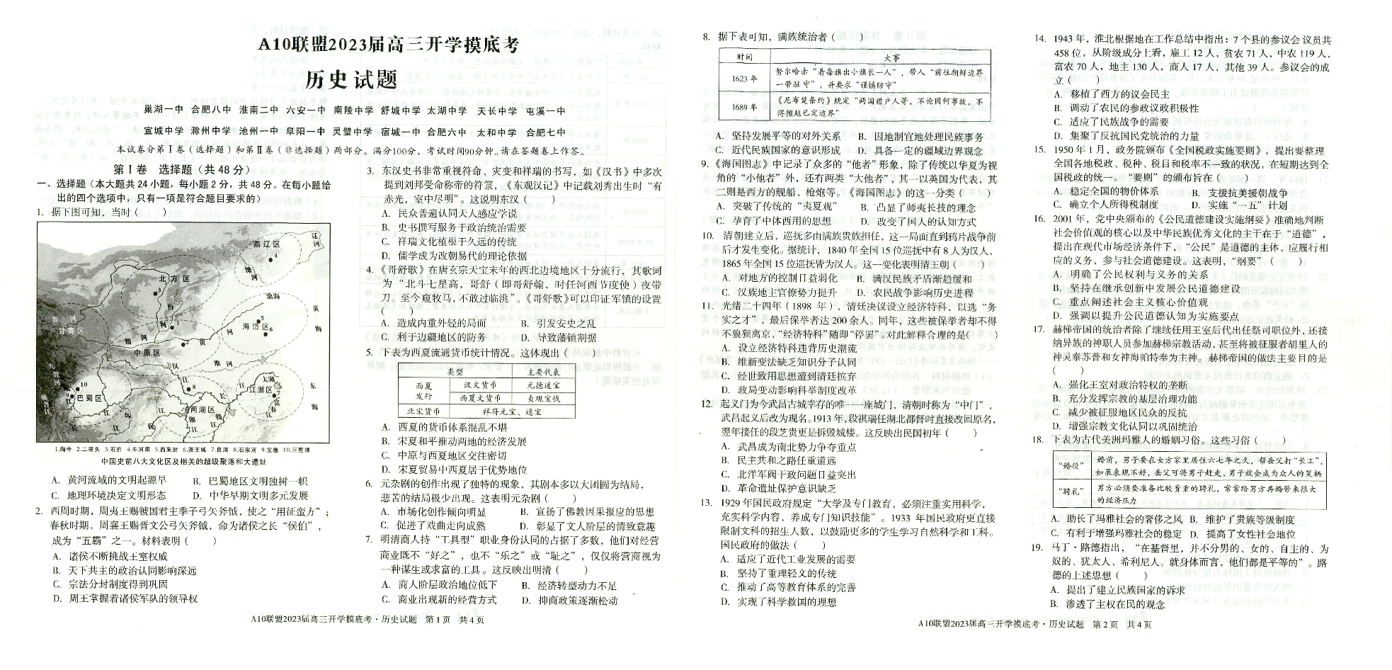 高三历史--安徽省A10联盟2023高三上学期开学考试