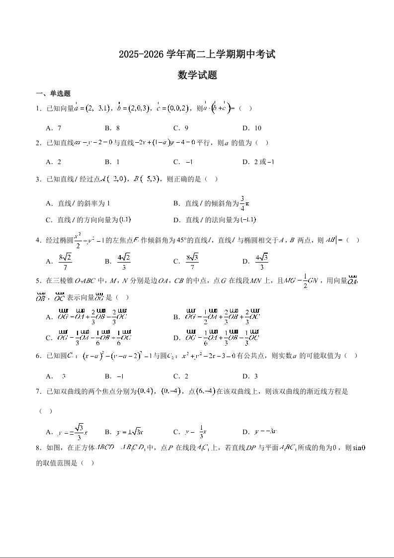 高二数学+答案--山东省德州市2025-2026学年高二上学期期中考试