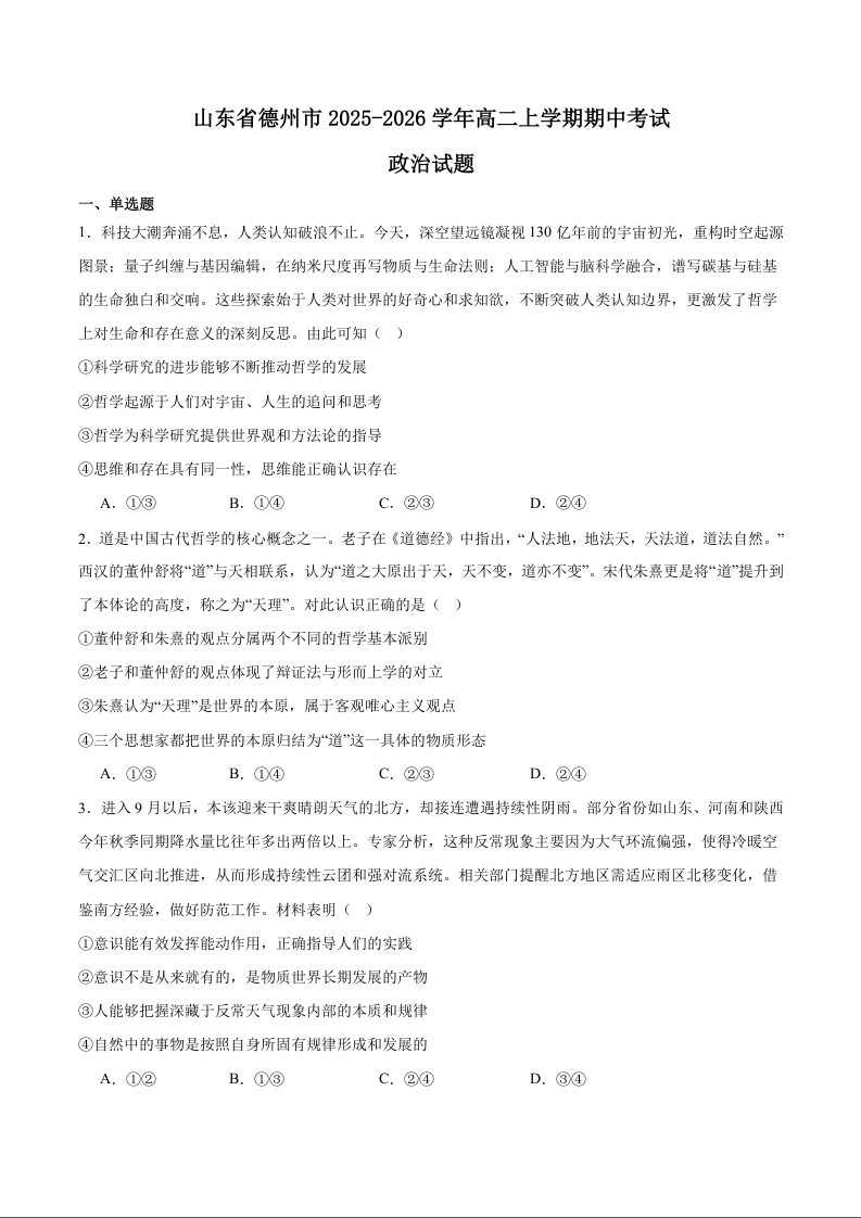 高二政治+答案--山东省德州市2025-2026学年高二上学期期中考试