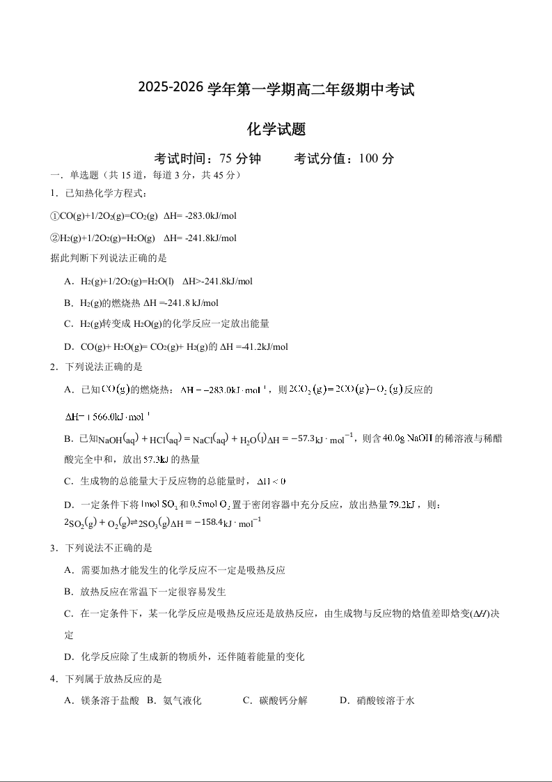 高二化学+答案--内蒙古呼和浩特市第二中学2025-2026学年高二上学期期中考试