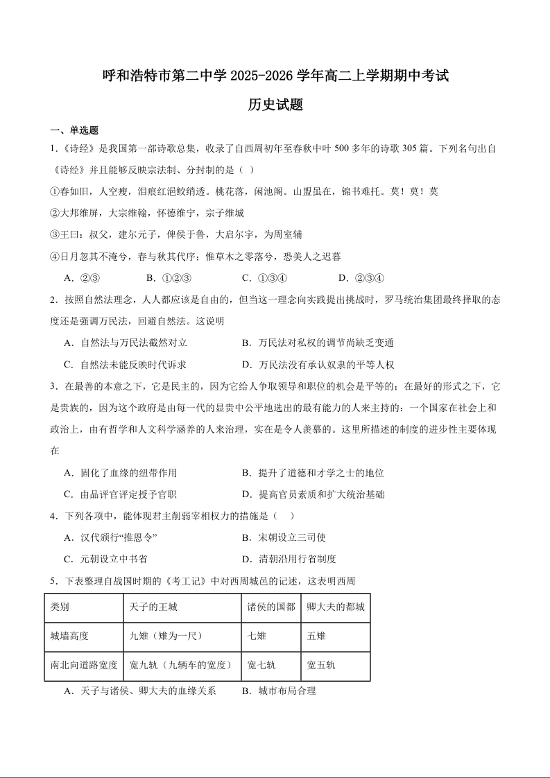 高二历史+答案--内蒙古呼和浩特市第二中学2025-2026学年高二上学期期中考试
