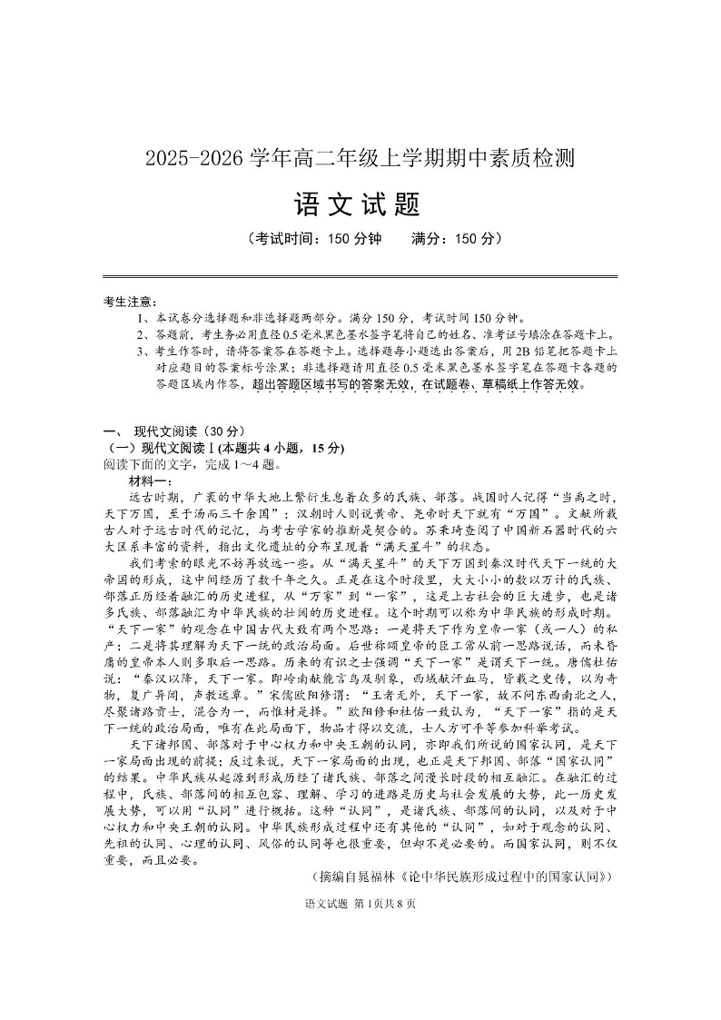 高二语文+答案--安徽师范大学附属中学2025-2026学年高二上学期期中考试