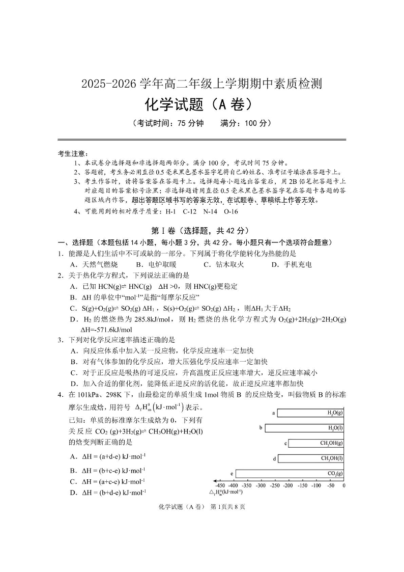 高二化学+答案--安徽师范大学附属中学2025-2026学年高二上学期期中考试