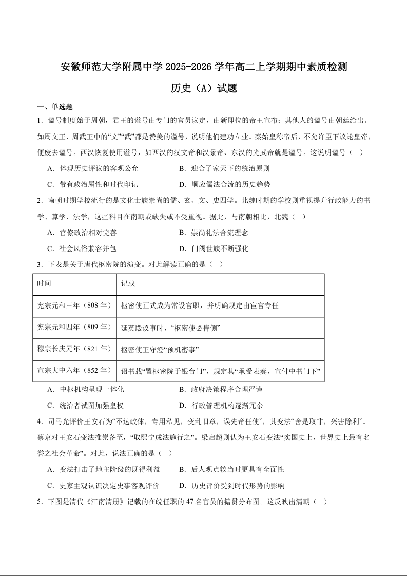 高二历史+答案--安徽师范大学附属中学2025-2026学年高二上学期期中考试