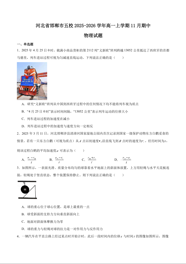高一物理+答案--河北省邯郸市五校2025-2026学年高一上学期期中考试