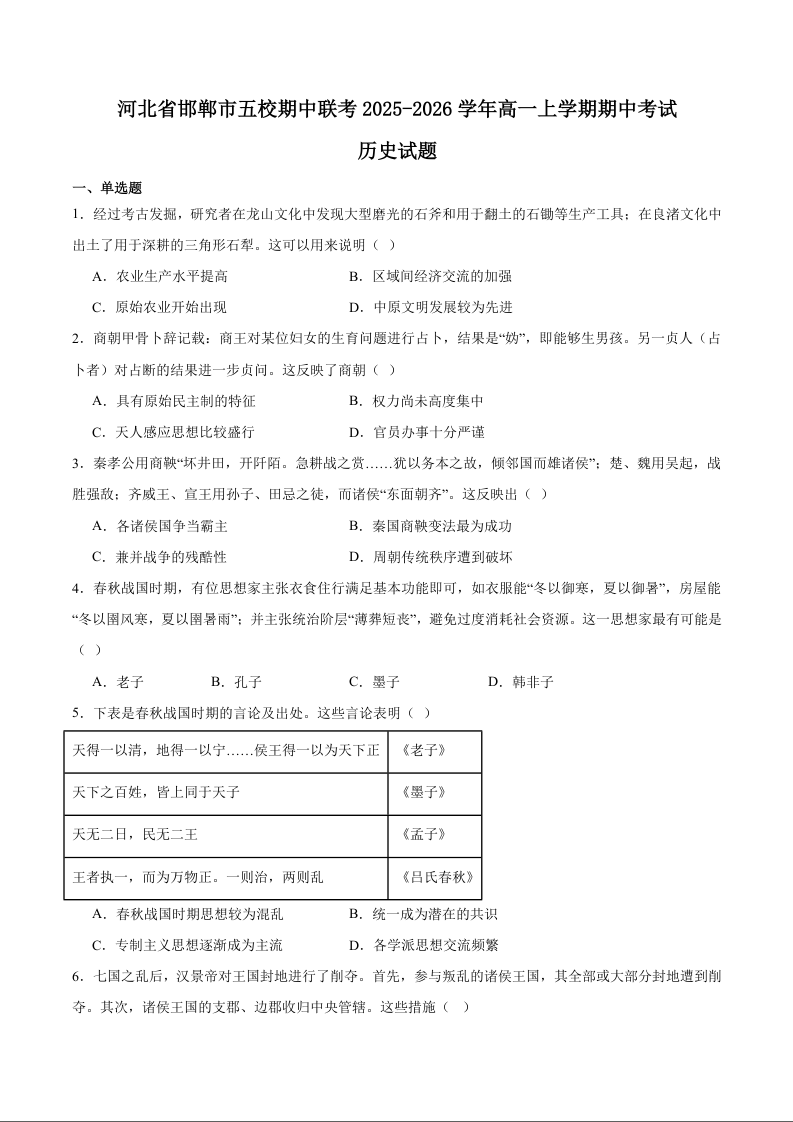 高一历史+答案--河北省邯郸市五校2025-2026学年高一上学期期中考试
