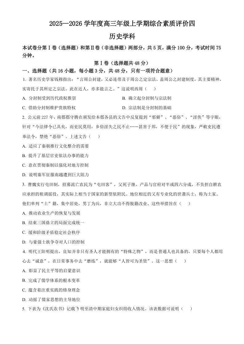 高三历史+答案--河北衡水中学2026届高三上学期12月月考