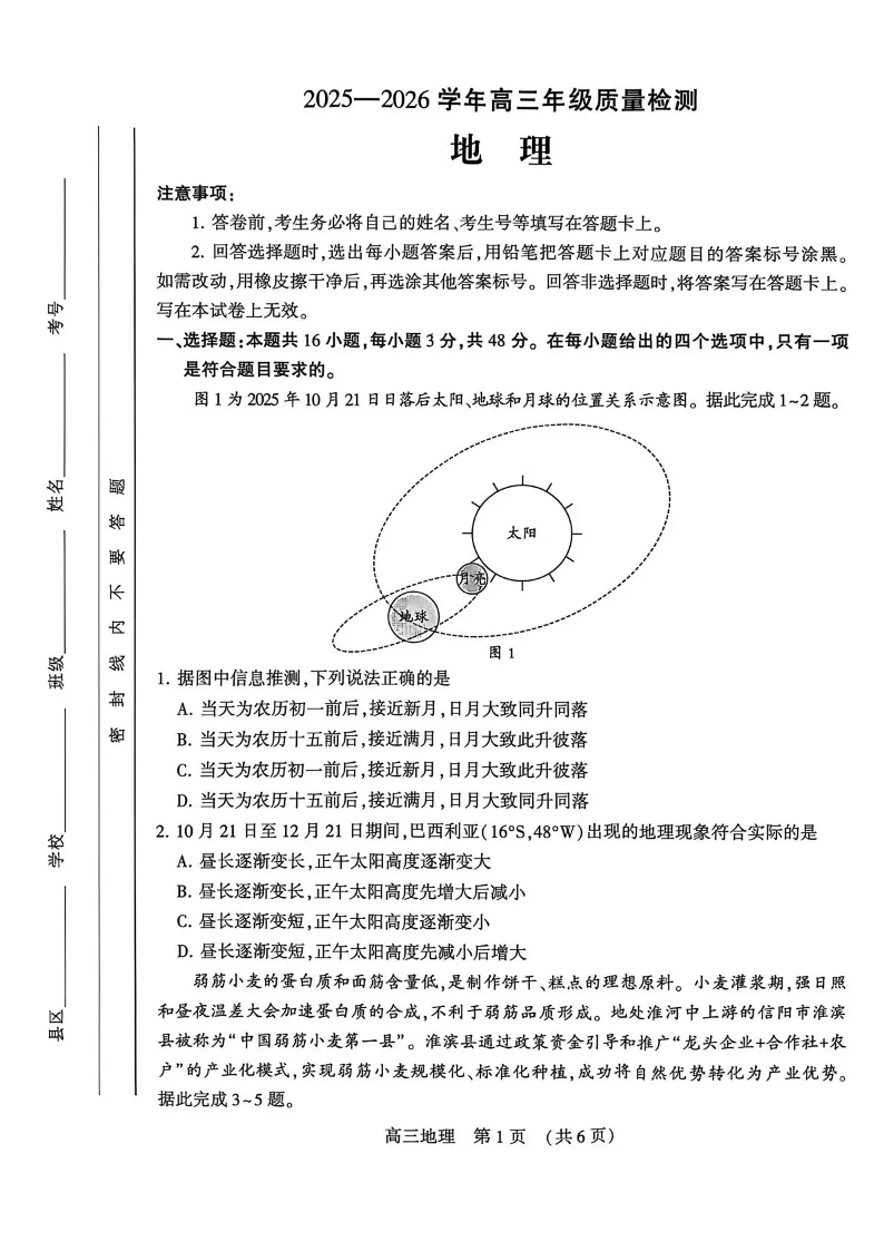 高三地理--河南省豫西北教研联盟(平许济洛)高三上学期1月质量检测