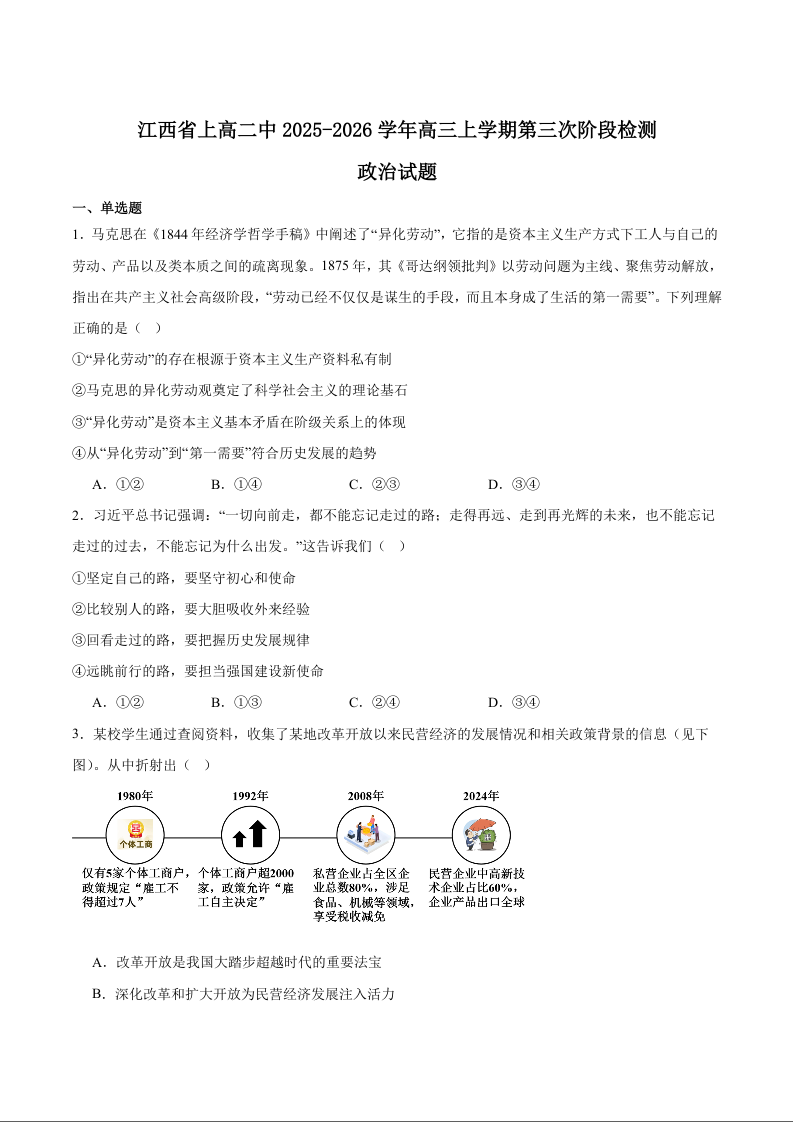 高三政治+答案--江西省上高二中2026届高三上学期第三次阶段检测