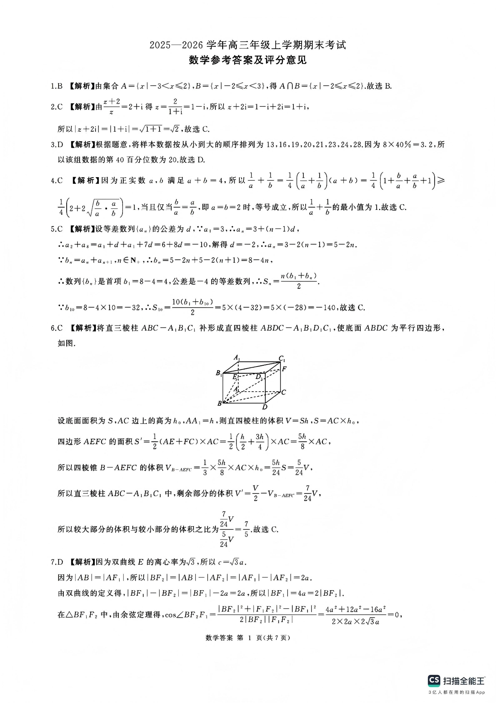 高三数学答案--百师联盟2026届高三上学期1月期末考试