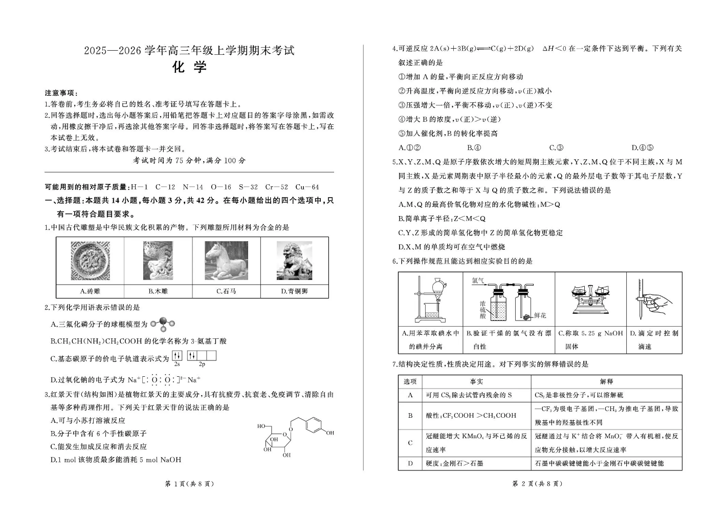 高三化学--百师联盟2026届高三上学期1月期末考试