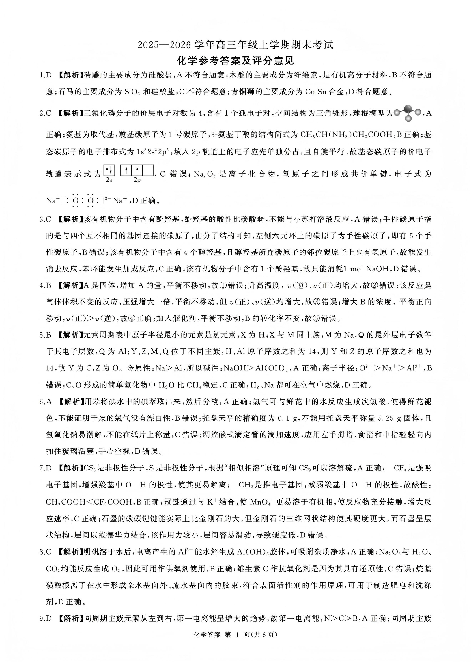 高三化学答案--百师联盟2026届高三上学期1月期末考试
