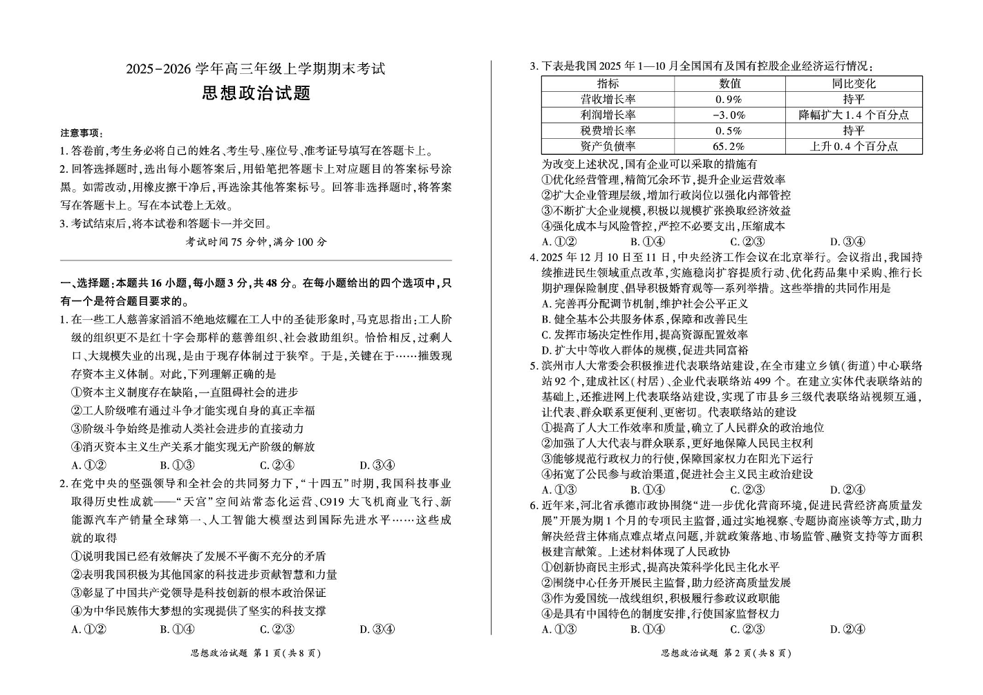 高三政治--百师联盟2026届高三上学期1月期末考试