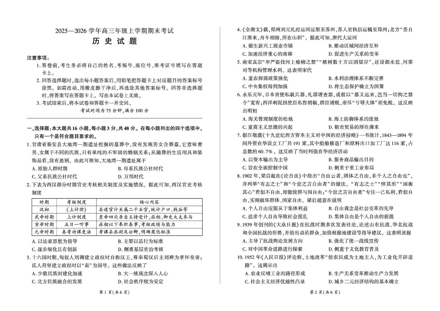 高三历史--百师联盟2026届高三上学期1月期末考试