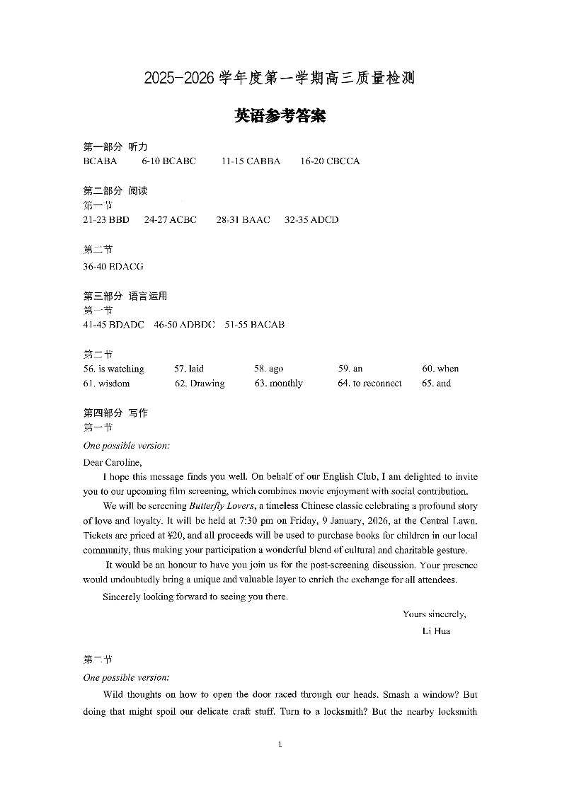 高三英语答案--山东省济宁市2026届第一学期高三质量检测期末考试
