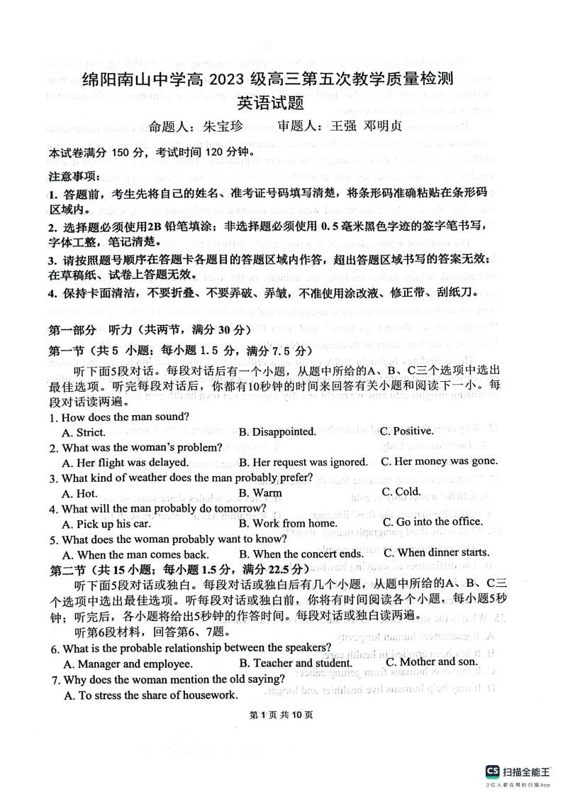 高三英语+答案--四川省绵阳南山中学2026届高三上学期第五次教学质量检测(二模)